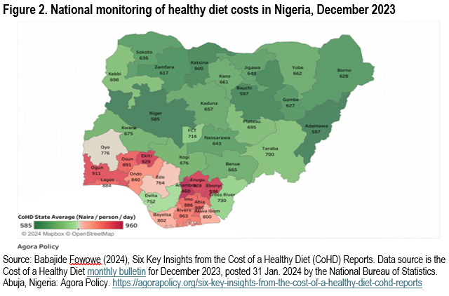 The data and methods needed to measure the cost and affordability of healthy diets were developed by the Food Prices for Nutrition project at Tufts University, in partnership with the FAO, the World Bank, IFPRI and a variety of government agencies and research collaborators around the world. The method uses food prices already being collected for the purposes of calculating consumer price indexes within countries, or for comparing purchasing power parity between countries, matching each item to its food composition and nutritional value to identify the least expensive products at each place and time. The cost per day of these items can then be used to identify areas where a healthy diet is less accessible. Figure 2 shows an example from Nigeria.